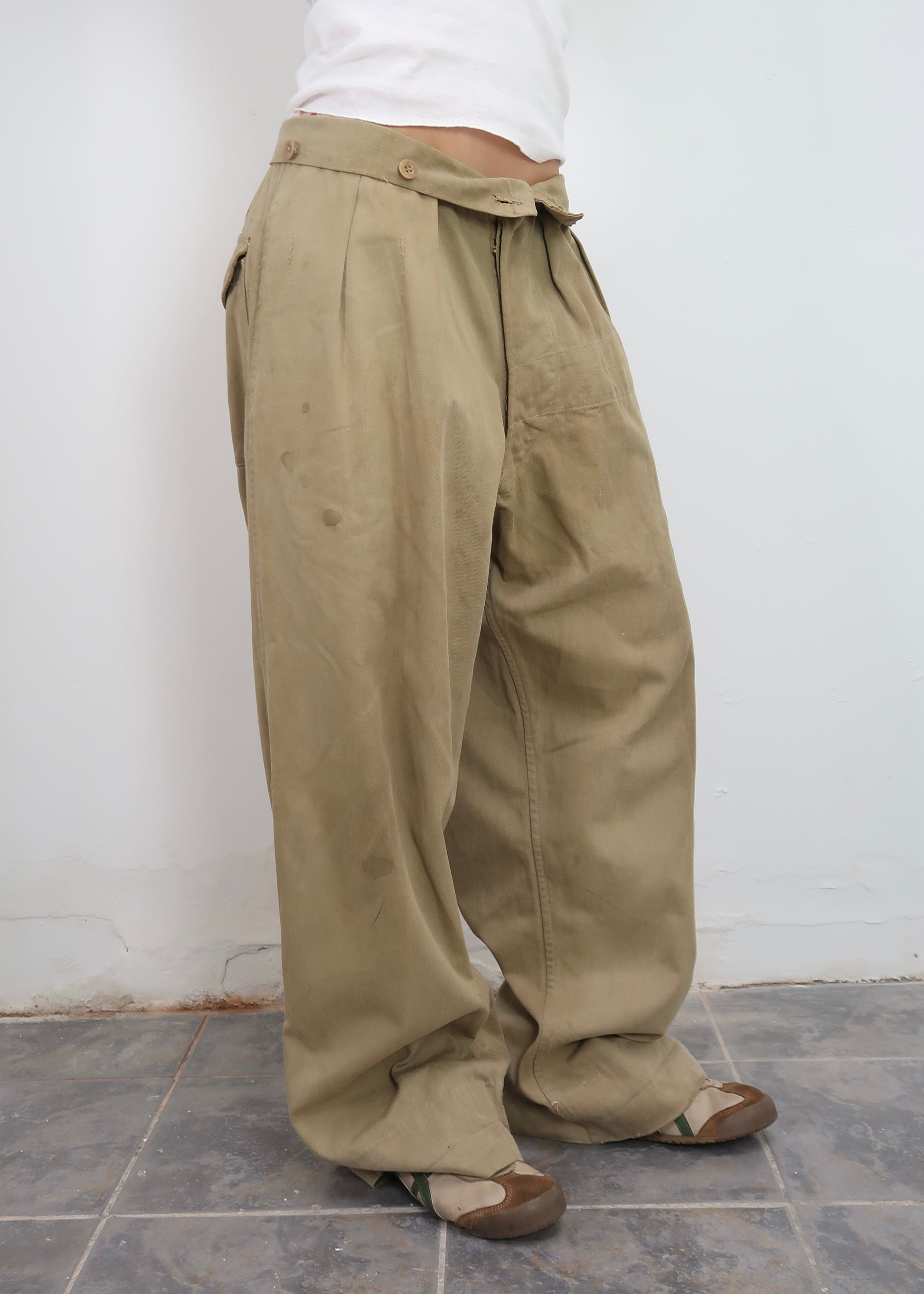 1940S INDIAN BRITISH ARMY PANTS. I HAVE TURNED THE WAIST OVER FOR THE PHOTO BUT THEY DO SIT MORE HIGH WASTED ON THE CORRECT SIZE.