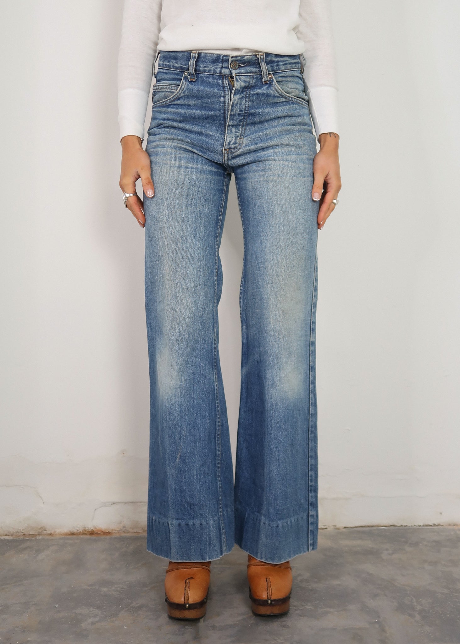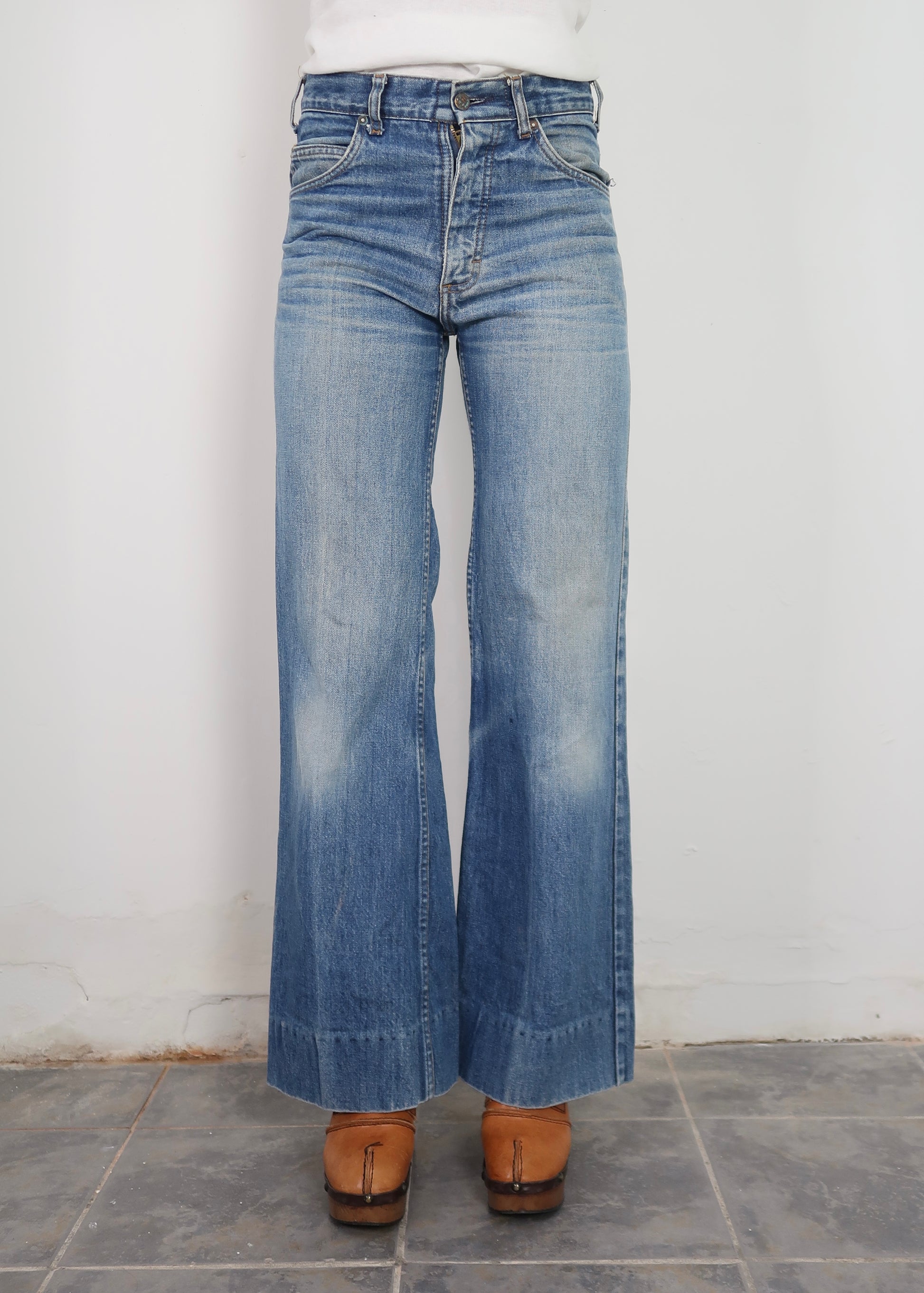 A great alternative to Levi'S. 1970S IS STOP EANS. FADING TO THE KNEES AND WHISKERING ON THE FRONT. THE PERFECT STRAIGHT WIDE LEG. SOME OF THE HARDWARE HAS GONE A LITTLE BIT OXIDISED.