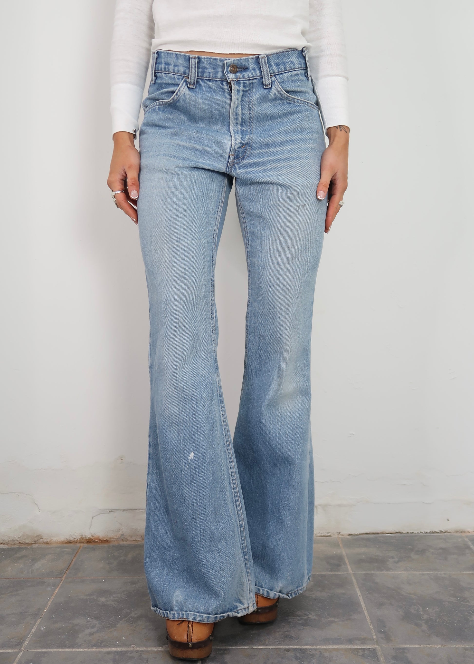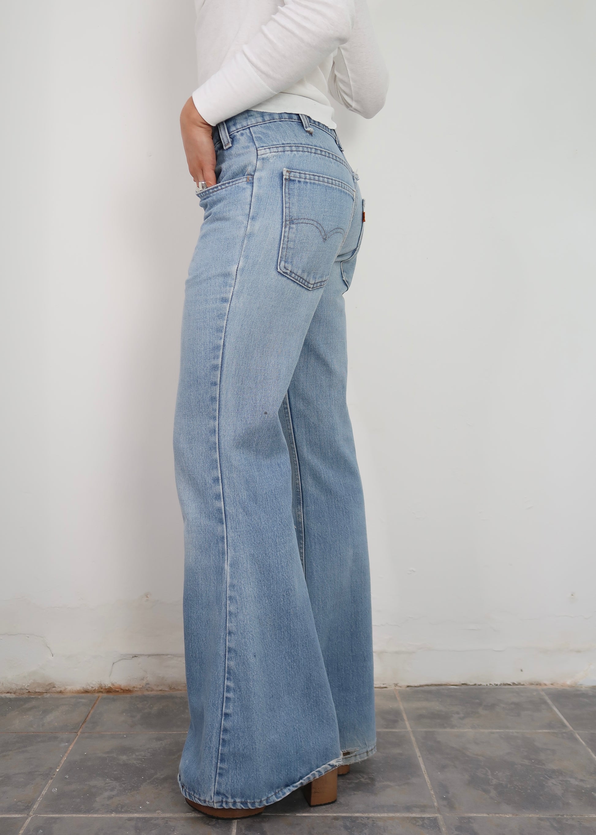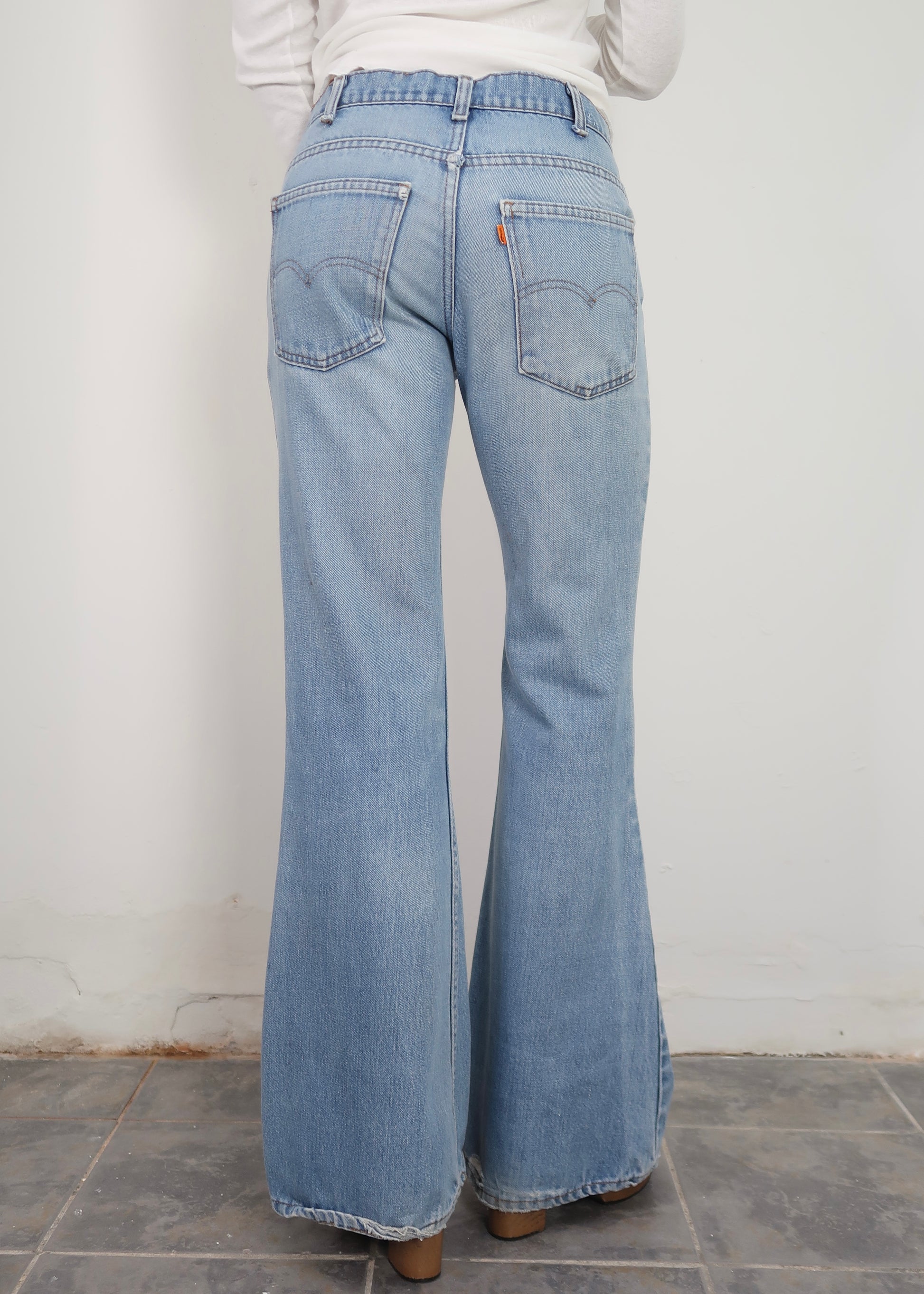 1970s light wash Levi's flares. They have some wearing to them. A good everyday jean. The size has been written in the back of the waistband in pen, this isn't an issue when wearing.
