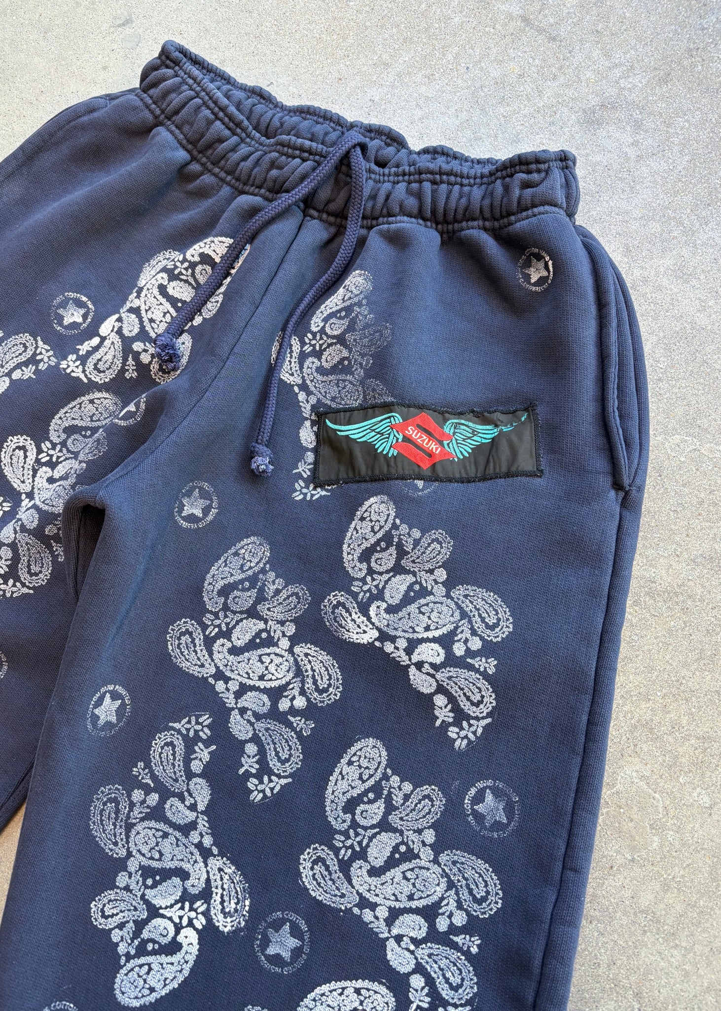Each pair features a genuine vintage 1970s motorcycle patch on the hip, individually hand sewn for an authentic, perfectly imperfect ‘patched up’ look.